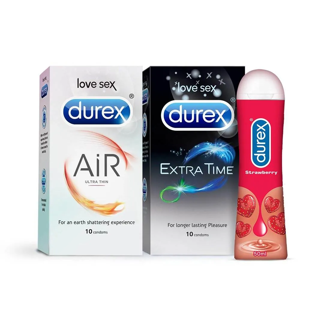 Durex Extra Time 10 pack + Durex Air 10 pack + Durex Saucy Strawberry lubricant gel 50 ml