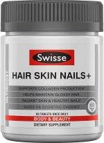 “Swisse Ultiboost Hair Skin and Nails Supplement. Specifically formulated to promote collagen production, each tablet of Ultiboost Hair Skin and Nails contains Silica, Iron, Zinc, and other natural vitamins to maintain glossy hair, radiant skin, and strong nails for both men and women. FEATURES Ingredients. Contains natural sources of Silica, Iron, Zinc, Milk Thistle, and Vitamin C. Collagen Production. Filled with Silica and Vitamin C, essential for collagen production. Biotin & Zinc. Key vitamins to help repair past damage and promote future hair, skin, & nail health. Detoxifies & Protects. Vitamin C & Milk Thistle detoxifies skin and protect against free radical damage. The Swisse Difference. Australia’s No. 1 supplement brand helping people live healthier & happier lives. (*This statement has not been evaluated by the Food and Drug Administration. This product is not intended to diagnose, treat, cure, or prevent any disease.)”